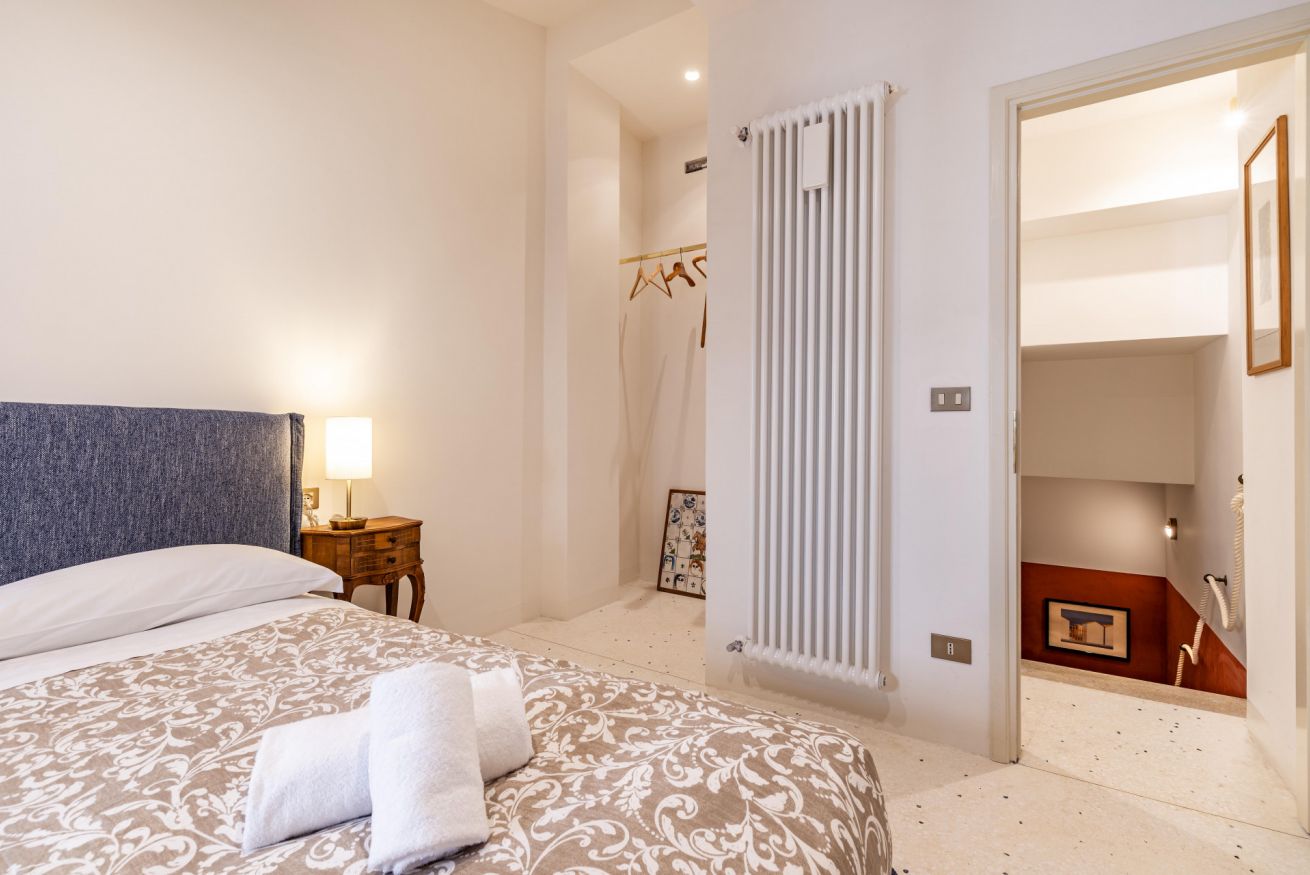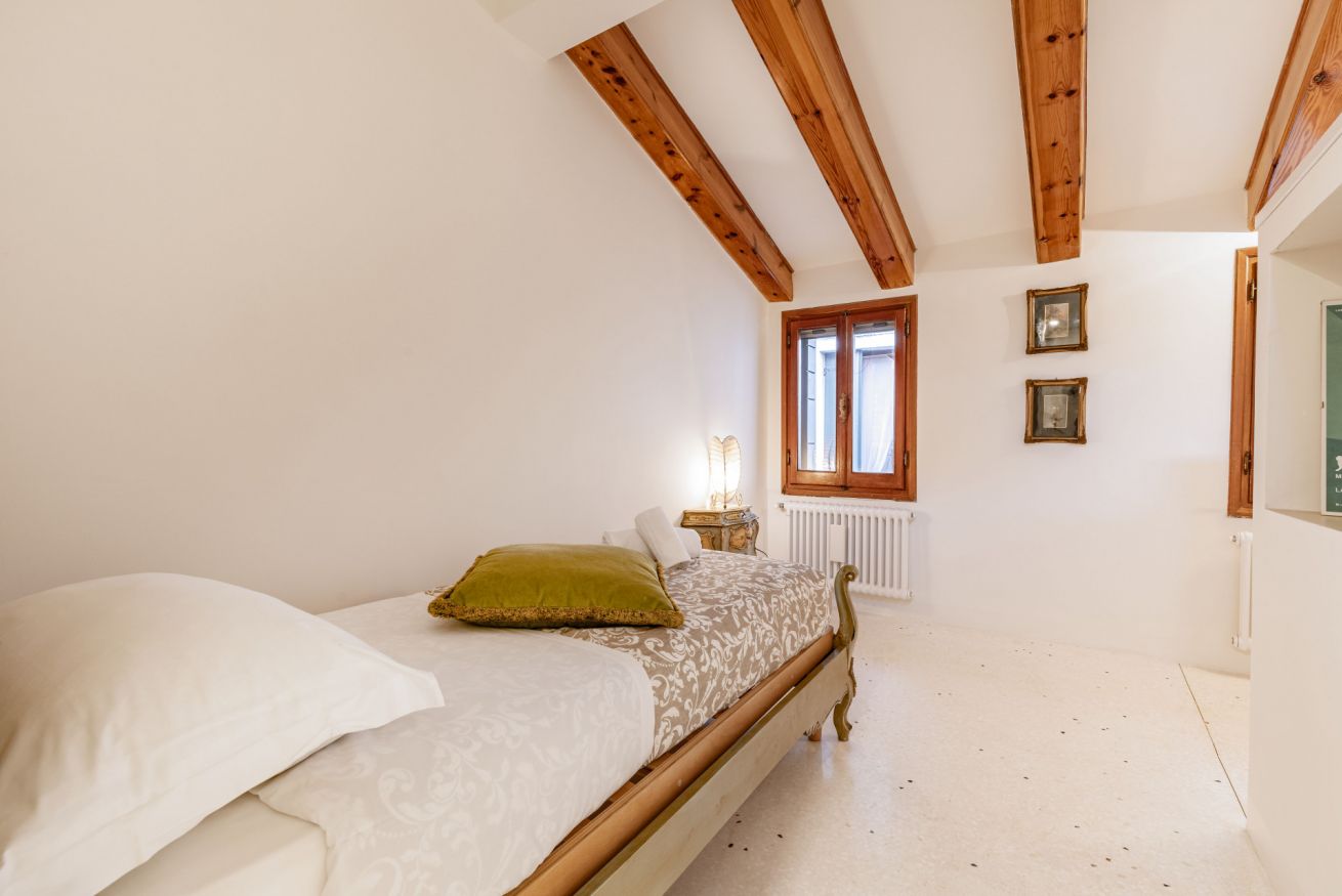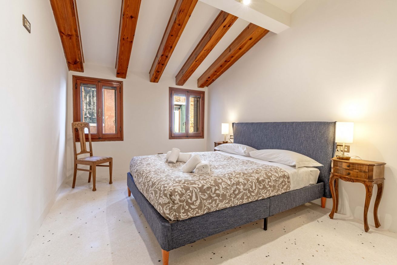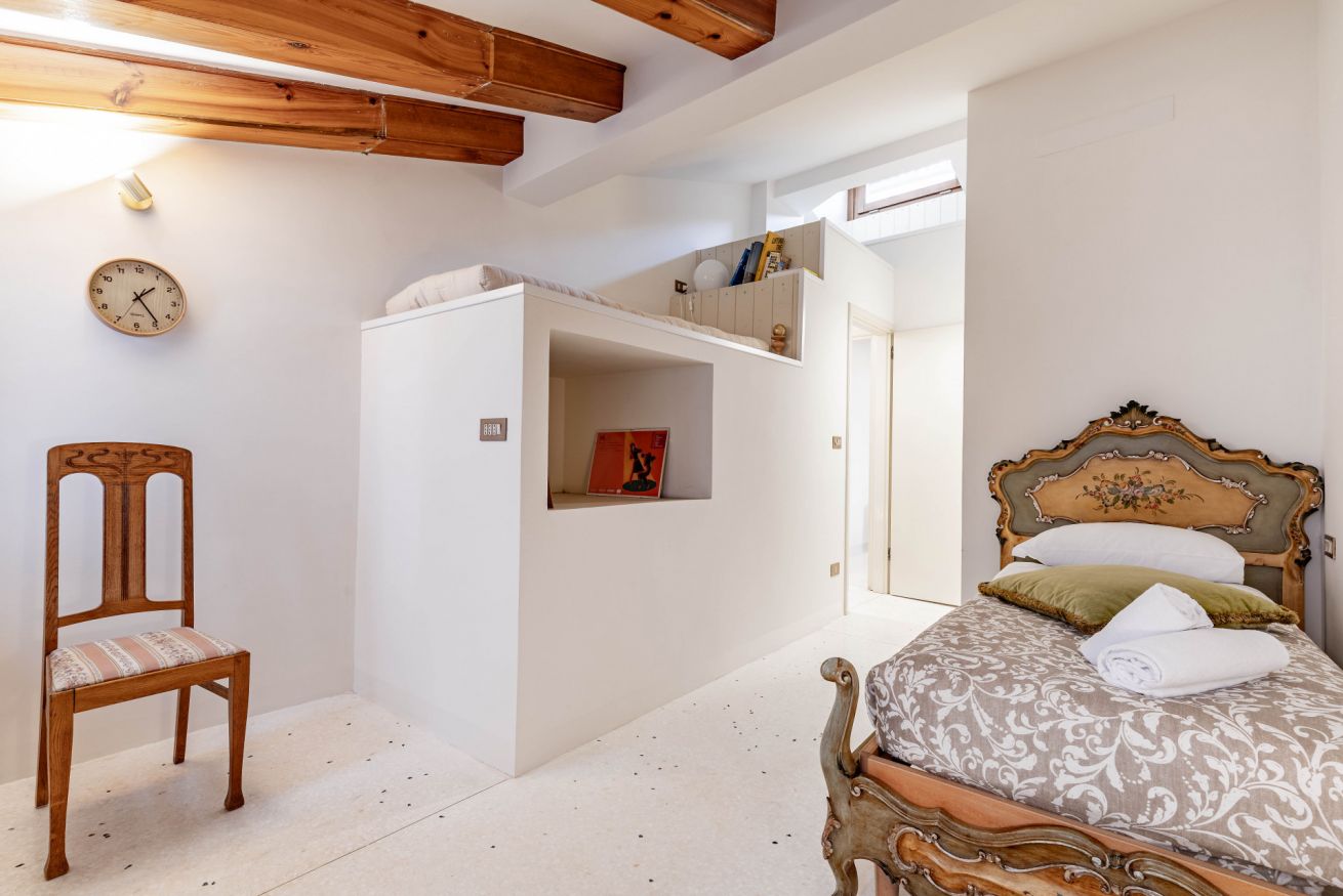 Al primo piano si sviluppa la zona notte, impreziosita da eleganti travi in legno a vista, che donano un’atmosfera intima e autentica. Qui si trovano una spaziosa camera matrimoniale e una camera singola, arredate con gusto e attenzione ai dettagli, per garantire un riposo confortevole. Ci si può anche rilassare a bere un caffè nello spazio esterno all'appartamento per vivere un'autenica esperienza veneziana!