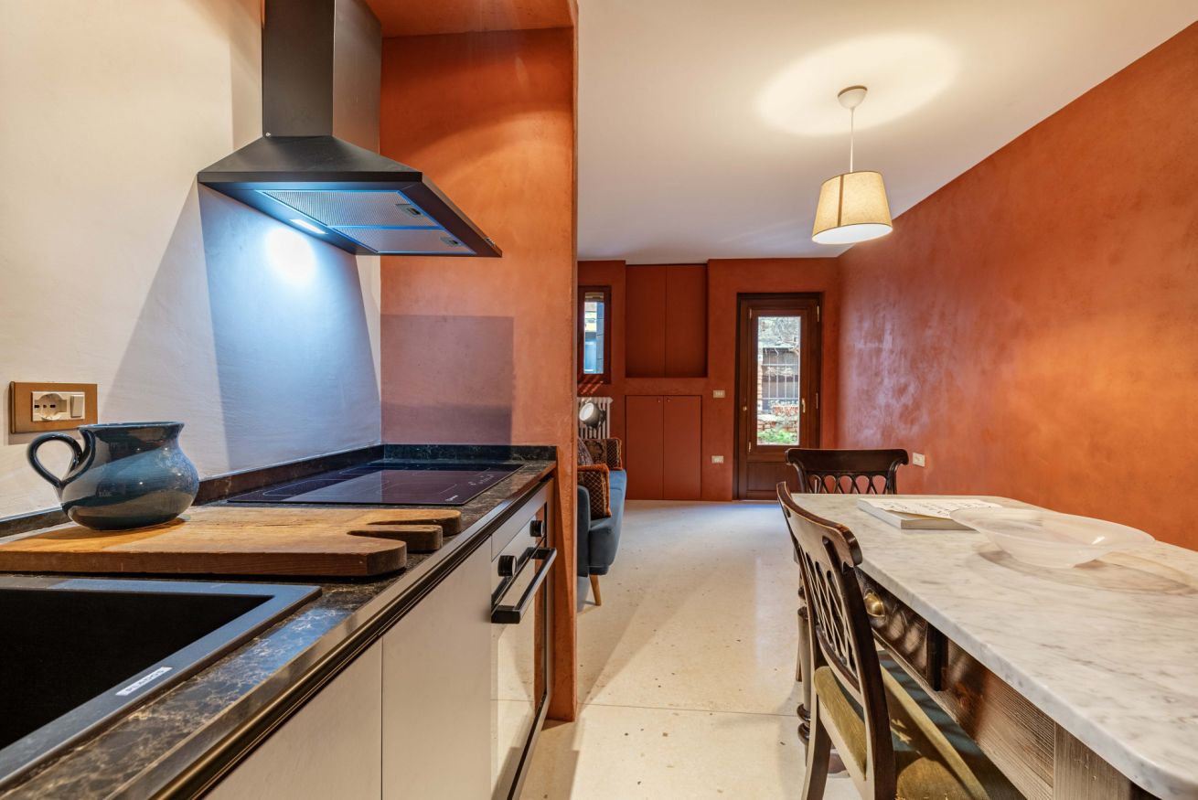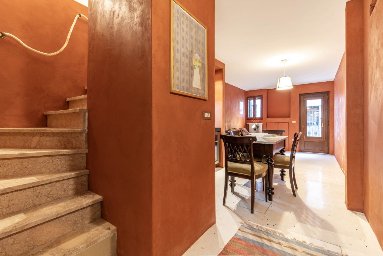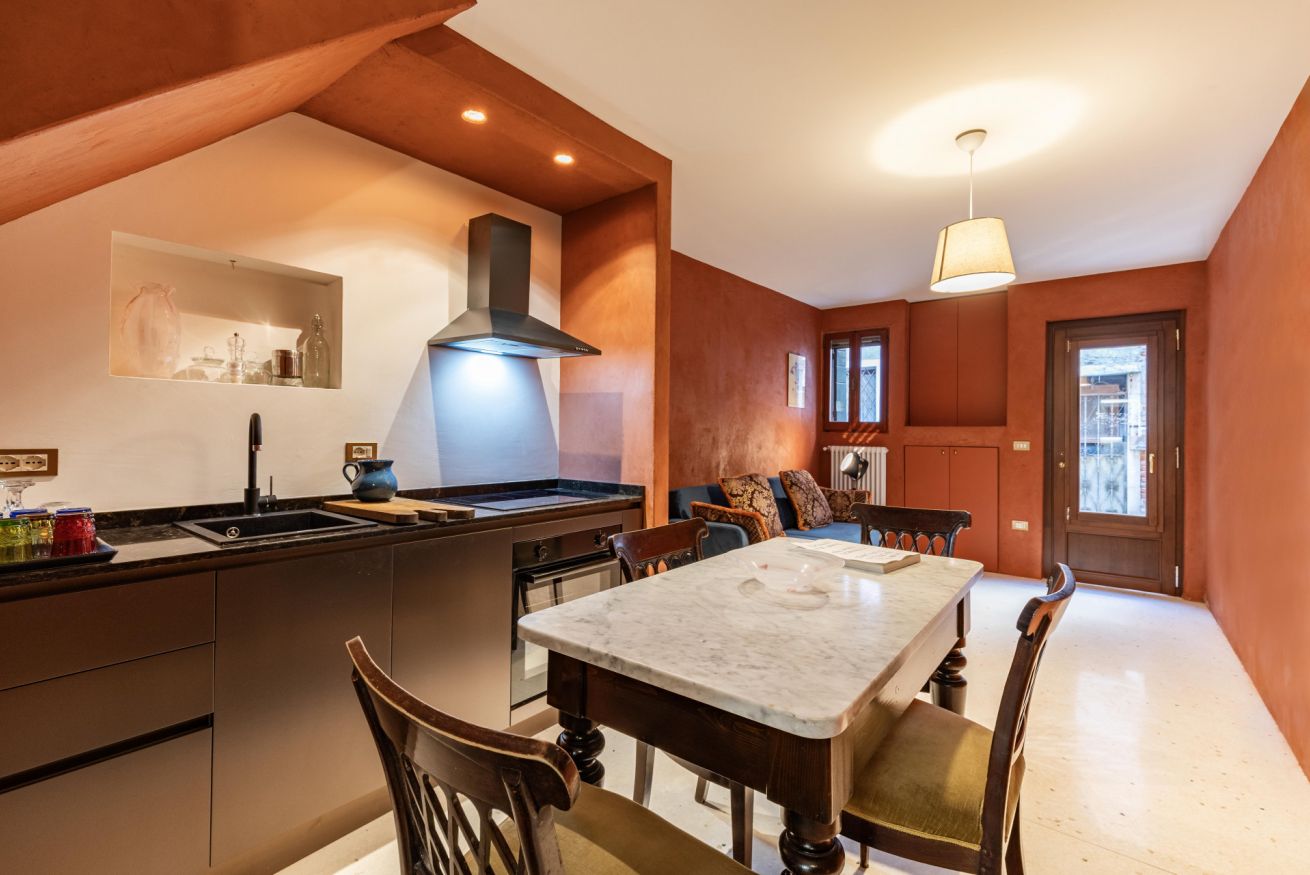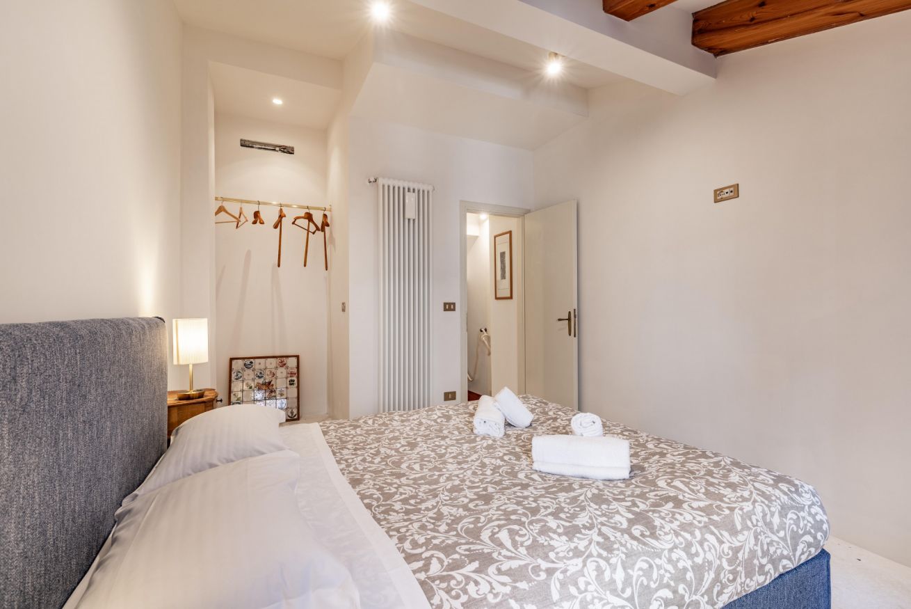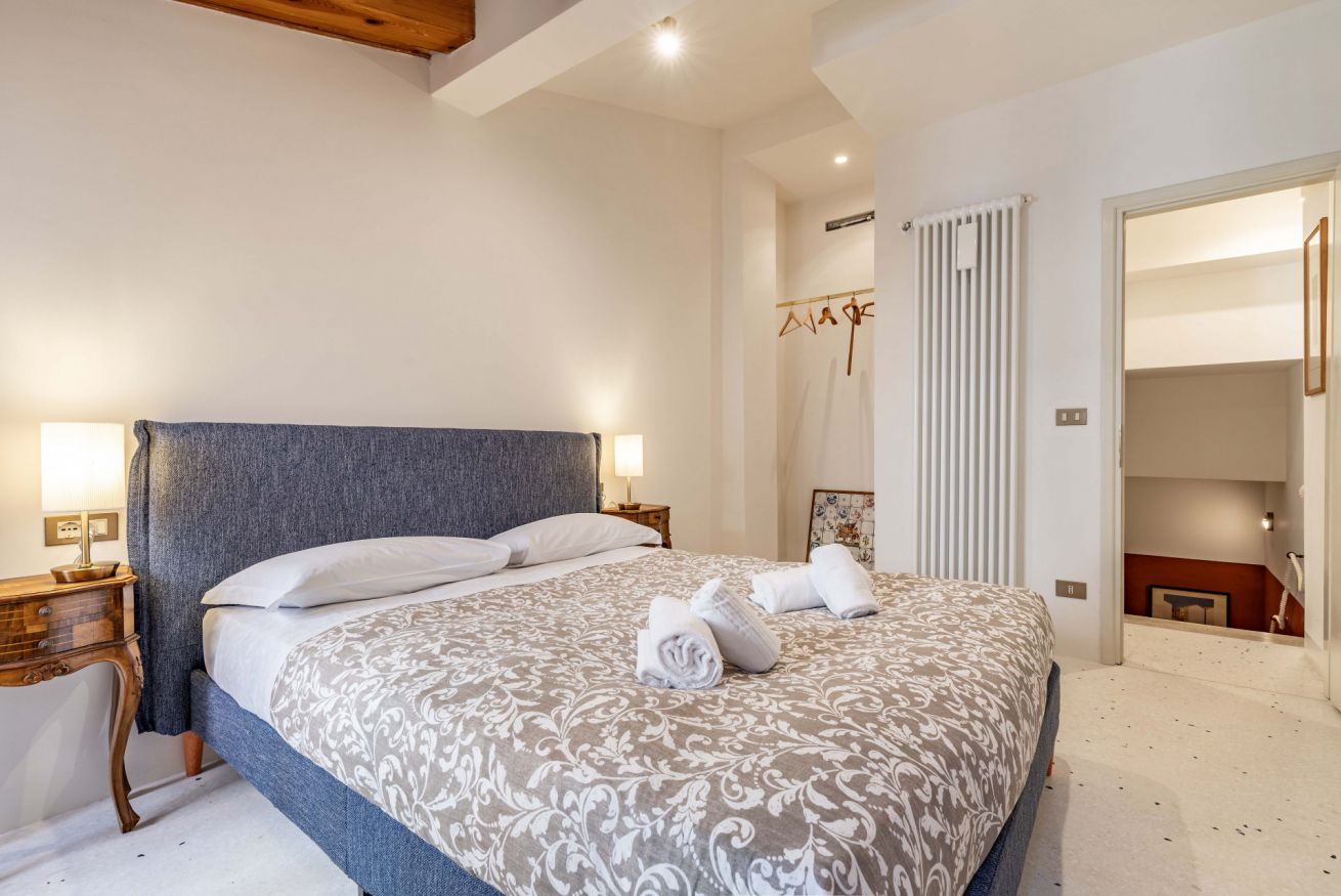 Al primo piano si sviluppa la zona notte, impreziosita da eleganti travi in legno a vista, che donano un’atmosfera intima e autentica. Qui si trovano una spaziosa camera matrimoniale e una camera singola, arredate con gusto e attenzione ai dettagli, per garantire un riposo confortevole. Ci si può anche rilassare a bere un caffè nello spazio esterno all'appartamento per vivere un'autenica esperienza veneziana!