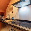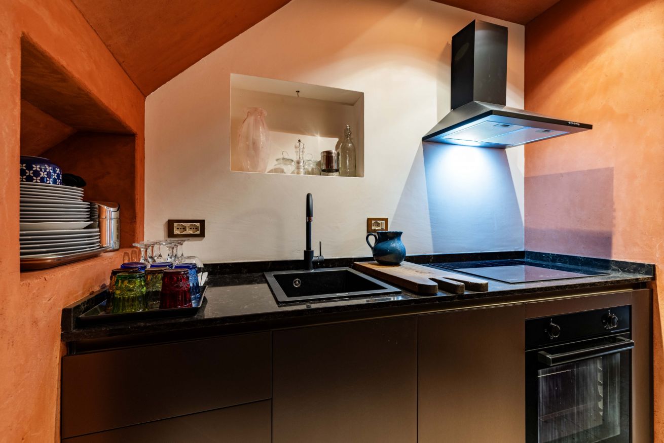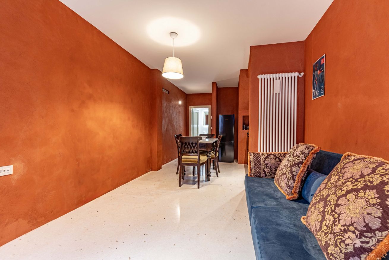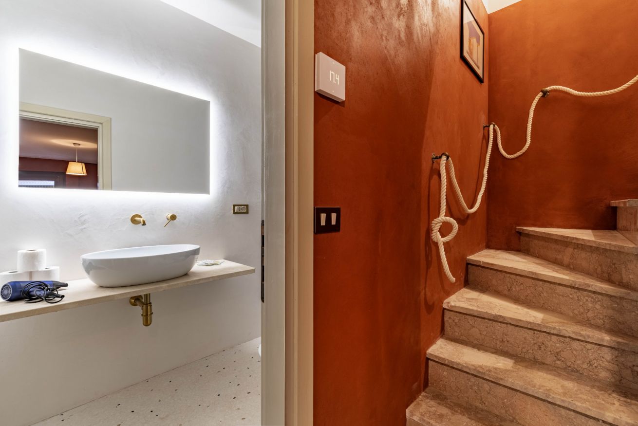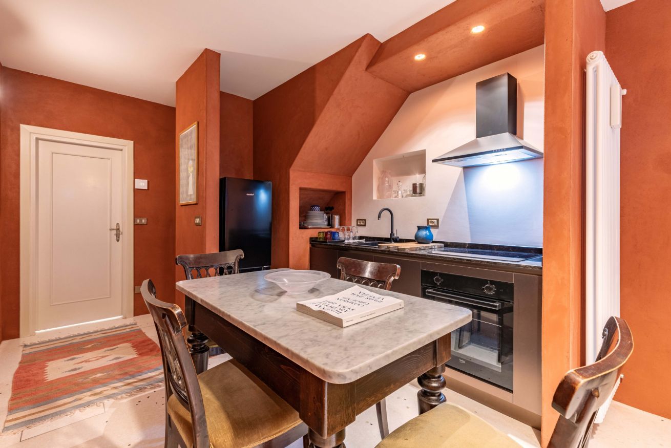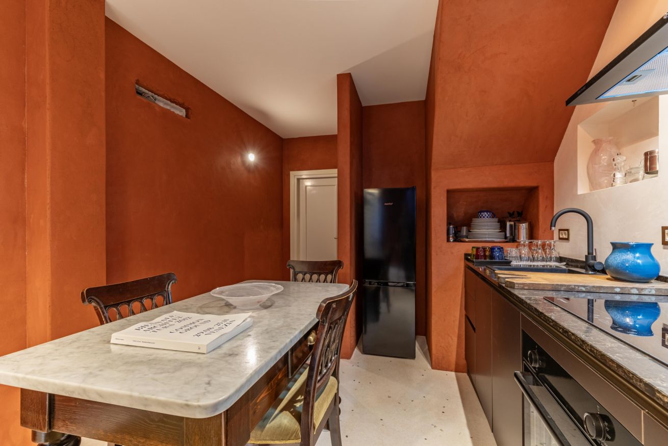 Al piano terra troverete un accogliente soggiorno con angolo cottura completamente attrezzato, caratterizzato da colori caldi e arredi ricercati, perfetto per rilassarsi dopo una giornata di visite. Completa il piano un bagno moderno con doccia.