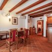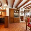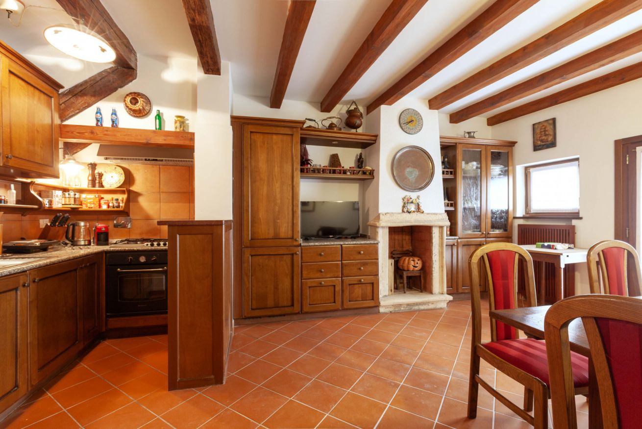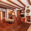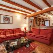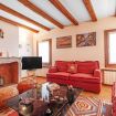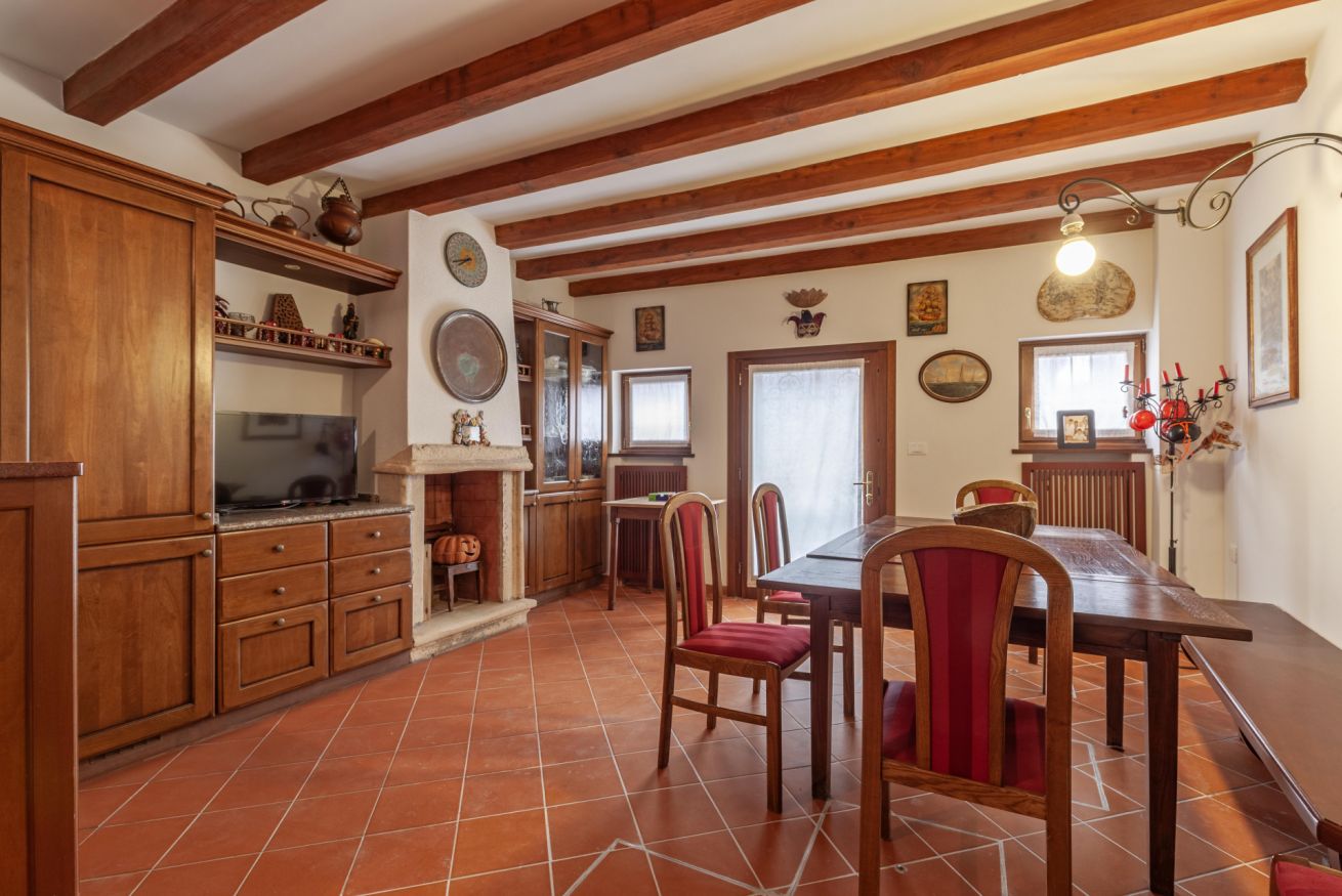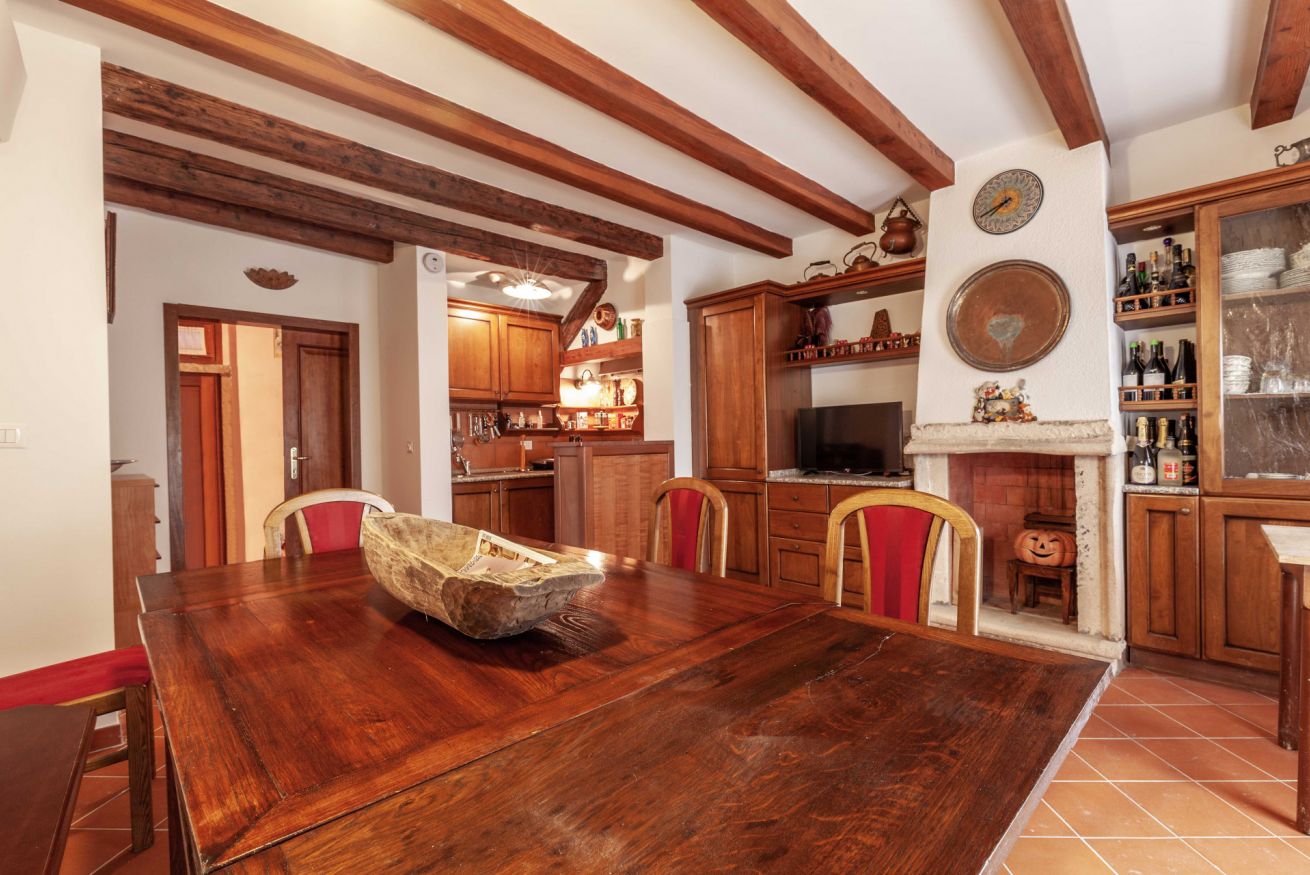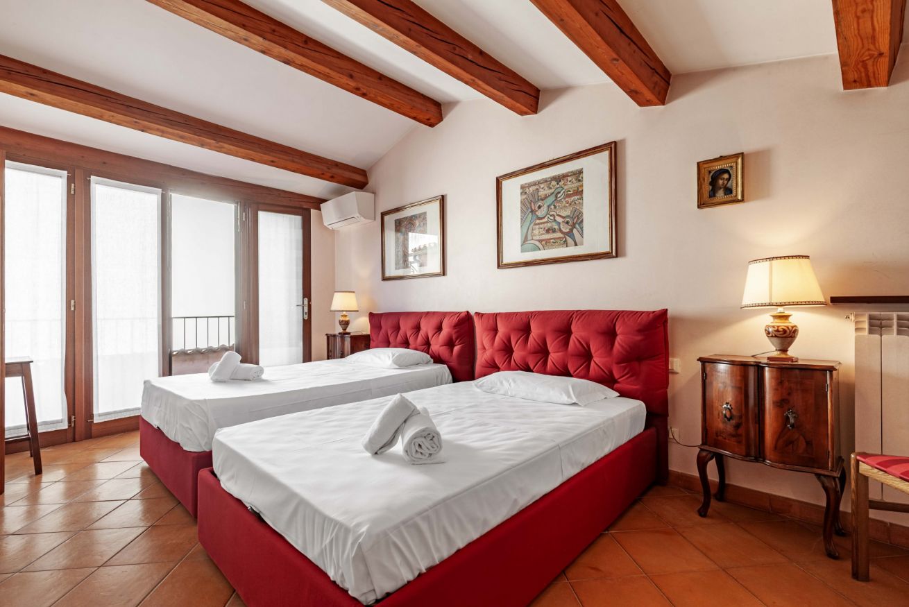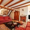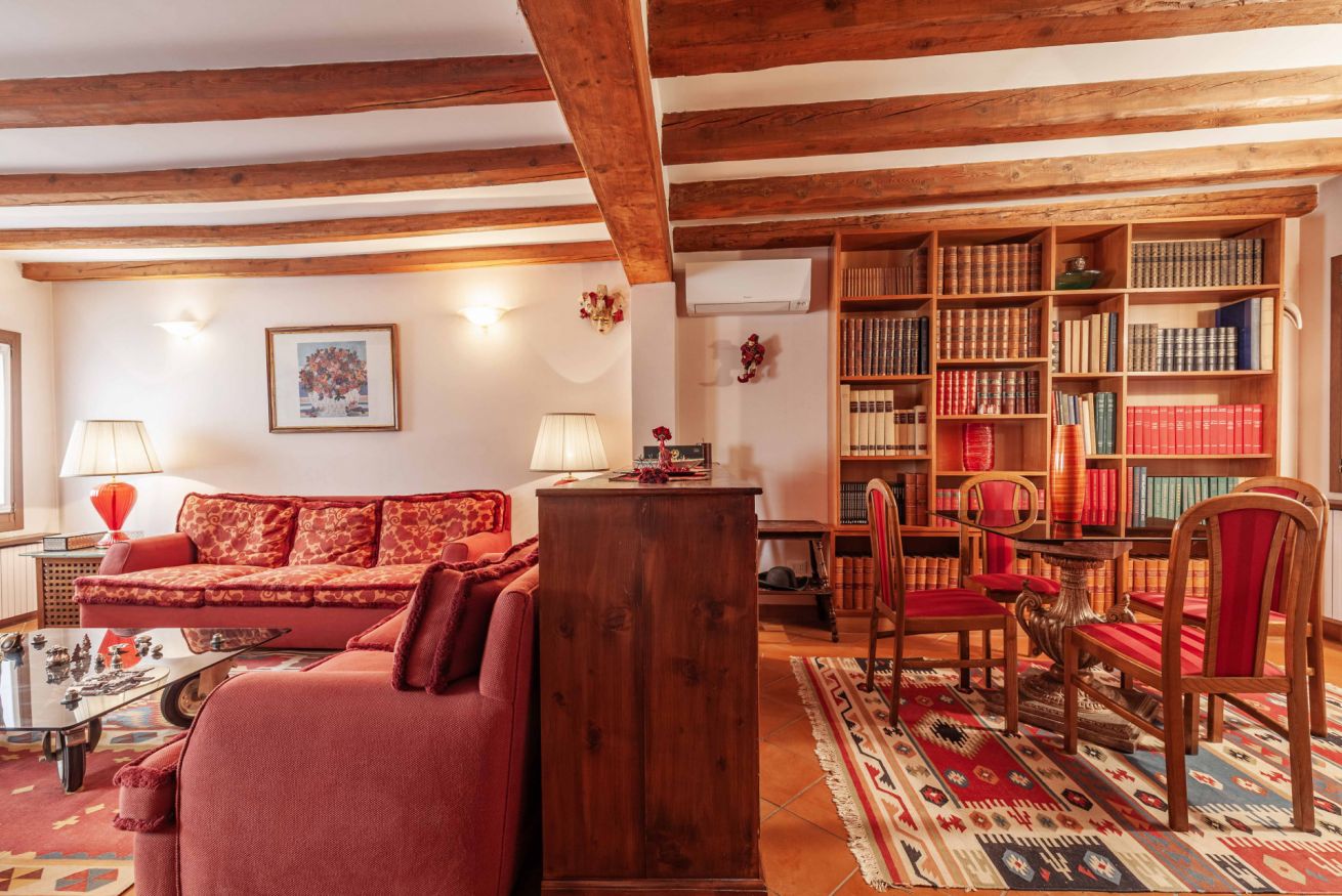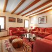 Il cuore della casa è l’ampio soggiorno, caratterizzato da splendide travi a vista e da un arredamento che unisce calore e comfort. I divani rossi invitano a rilassarsi dopo una giornata di esplorazioni, il camino decorativo aggiunge un tocco di eleganza e il grande tappeto colorato dona vivacità all’ambiente. È uno spazio perfetto da condividere: luminoso, accogliente e ricco di dettagli che rendono l’ambiente unico.