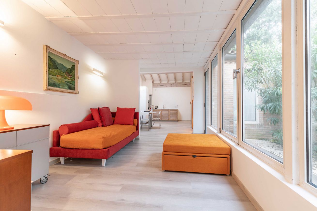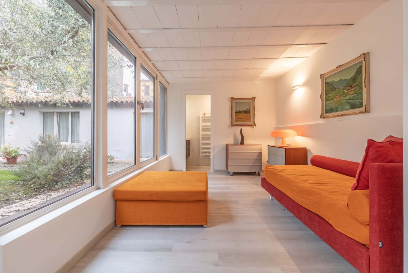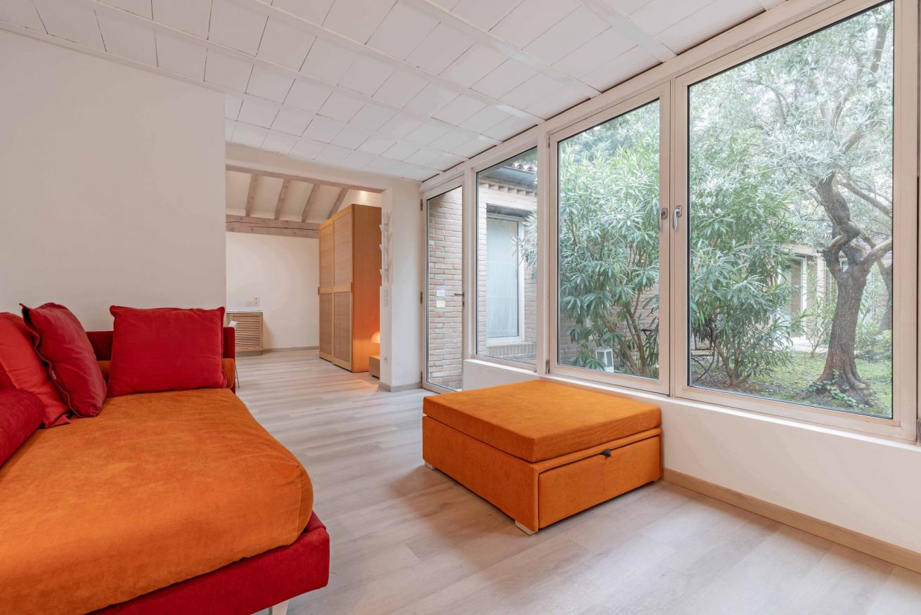 The apartment features a welcoming double bedroom, a modern bathroom with shower ensuite and one connected to the spacious living room, ideal for relaxing after a day spent exploring the streets and canals. Outside, there's a pleasant shared garden area, perfect for an al fresco breakfast or a quiet moment immersed in the typical Venetian atmosphere.