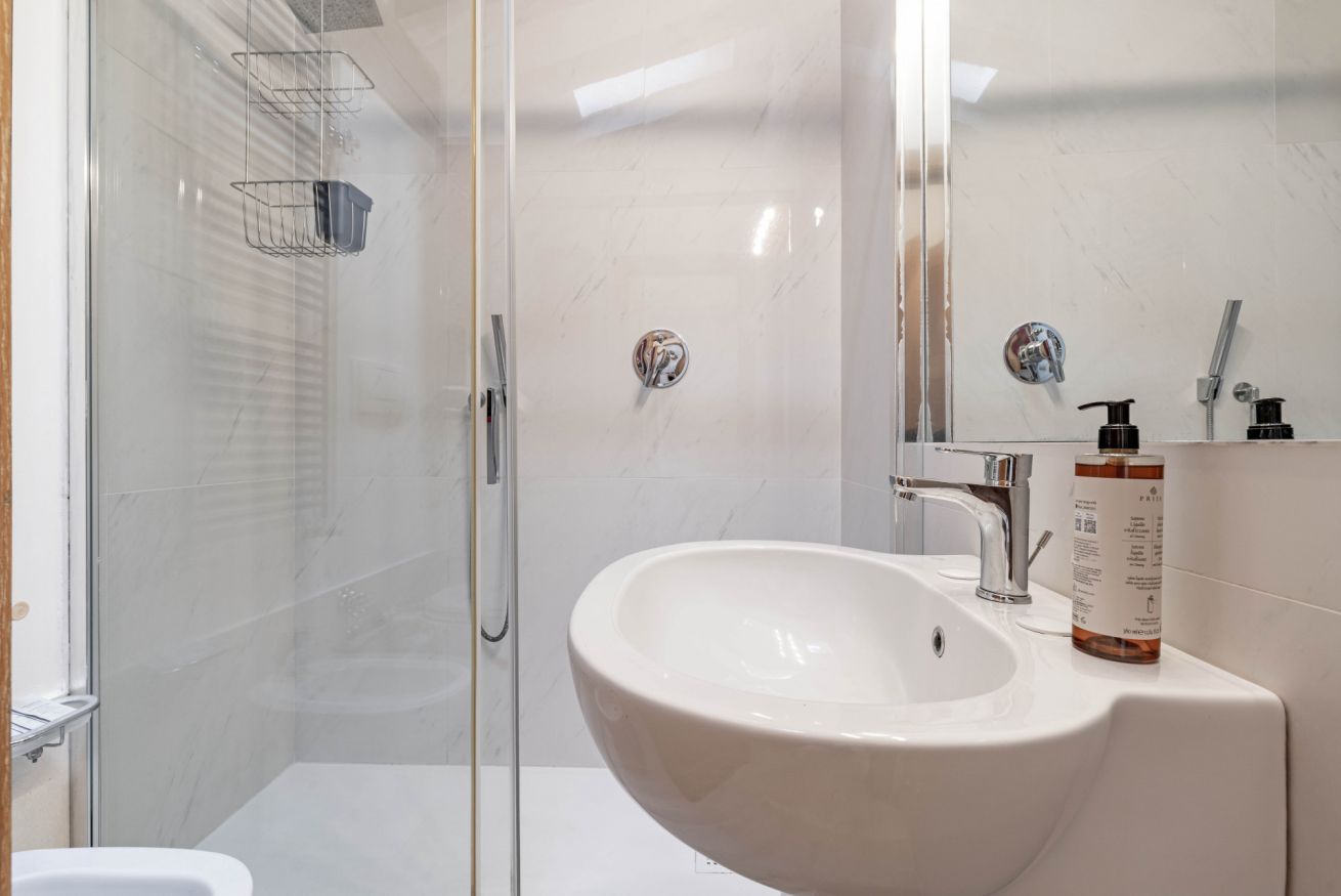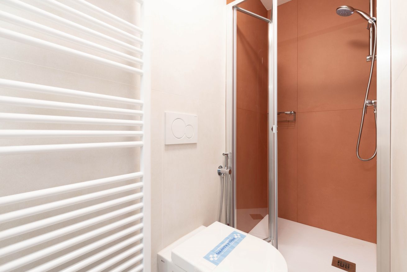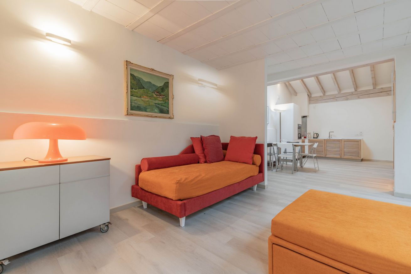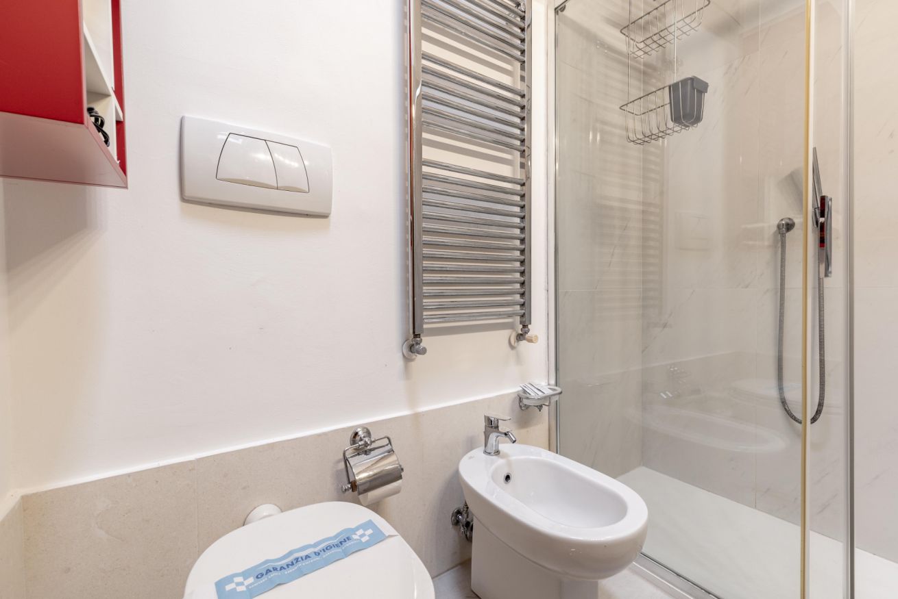 The apartment features a welcoming double bedroom, a modern bathroom with shower ensuite and one connected to the spacious living room, ideal for relaxing after a day spent exploring the streets and canals. Outside, there's a pleasant shared garden area, perfect for an al fresco breakfast or a quiet moment immersed in the typical Venetian atmosphere.